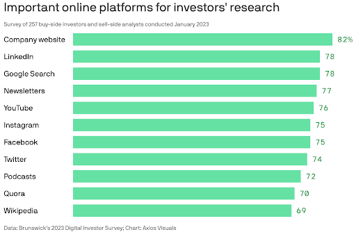 The hook for Axios piece appears to be a 2023 survey by the fine people at Brunswick Group that documents the significant importance of digital and social channels for investor information uptake and gathering. This was a telling graphic: